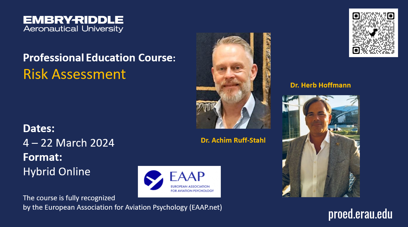 This 3-week, part-time virtual online course taught by Dr. Hans-Joachim Ruff-Stahl and Dr. Herb Hoffmann will prepare managers, entrepreneurs, and organizational members from the sharp end in aviation and other high risk / high consequence areas to understand, develop, and practice a simple yet effective process of risk analysis, risk assessment, and risk control with the intent to meet an organization's safety goals.